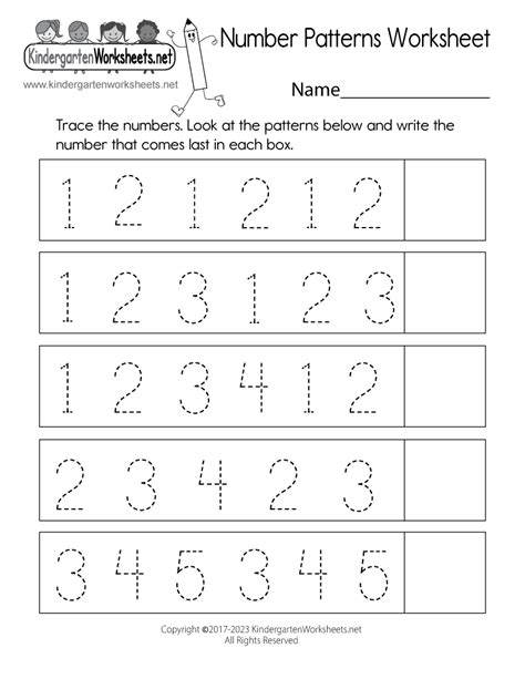 Free Printable Number Patterns Worksheet for Kindergarten from www.kindergartenworksheets.net