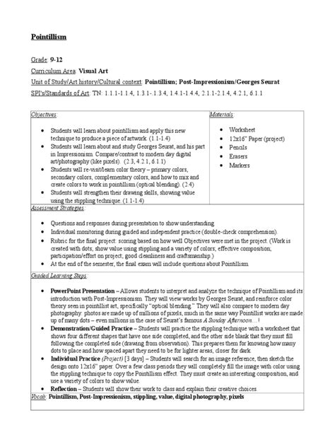 Web Unit Plan For Georges Seurat Inspired Pointillism Project Includes: